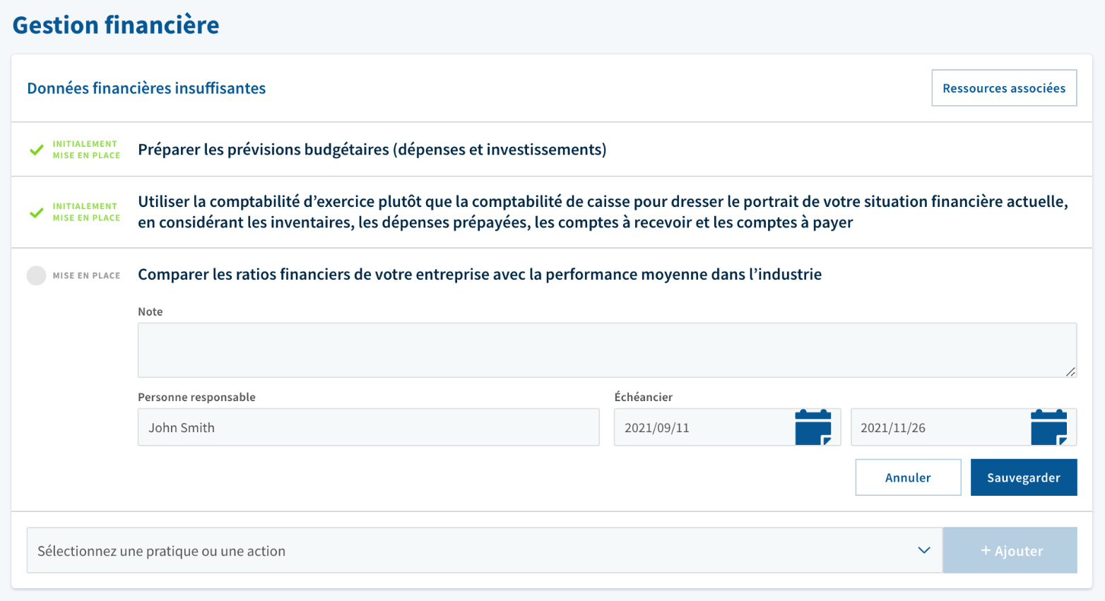 La fonction « Plan d’action », un outil de planification simple et clair, permet à l’utilisateur d’établir des buts et des objectifs afin d’atténuer les risques importants pour sa ferme. Il peut sélectionner l’une des pratiques exemplaires recommandées dans un menu déroulant ou ajouter sa propre pratique pour gérer les risques auxquels il fait face. Cette fonction offre également l’option d’attribuer la responsabilité et de fixer un délai pour chaque mesure à prendre. Une fois terminée, l’action peut être marquée comme ayant été « mise en place » en un seul clic.